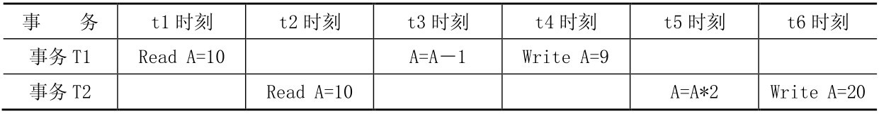 如表6-1所示,事务T1在t1时刻读取A值为10,在t4时刻写回值为A=A-1=9;在t2时刻,事务T2与T1并发执行,此时A值为10,所以T2在t6时刻写回值为A=A*2=20,而这是不正确的,A值应为18,原因就是在t5时刻丢失了事务T1对数据库的控制。