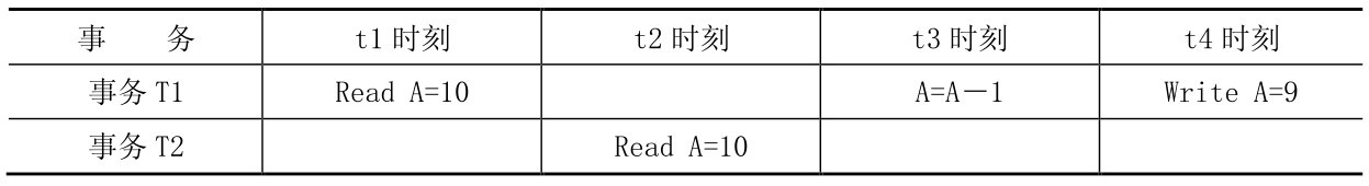 如表6-2所示,事务T1在t1时刻读取A值为10,在t4时刻写回值为A=A-1=9,A值已更新;而事务T2在t2时刻读的是过时的数据,造成数据不一致。
