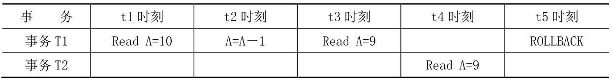 如表6-3所示,事务T1在t2时刻将A值修改为9,并在t5时刻写回磁盘,即做了ROLLBACK操作,但在事务T2读取值A=9后,事务T1被撤销,被T1修改为9的A值恢复为10,所以T2读取的A值与数据库中的数据不一致,即事务T2读到的数据为脏数据。