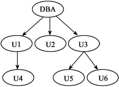 DBA将权限授予用户U1、用户U2、用户U3,用户U1将权限转授给用户U4,用户U3将权限转授给用户U5和用户U6。