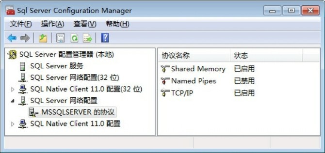 客户端要连接到SQL Server 2012数据库引擎,必须启用某种服务器协议。使用SQL Server配置管理器能够进行如下配置。