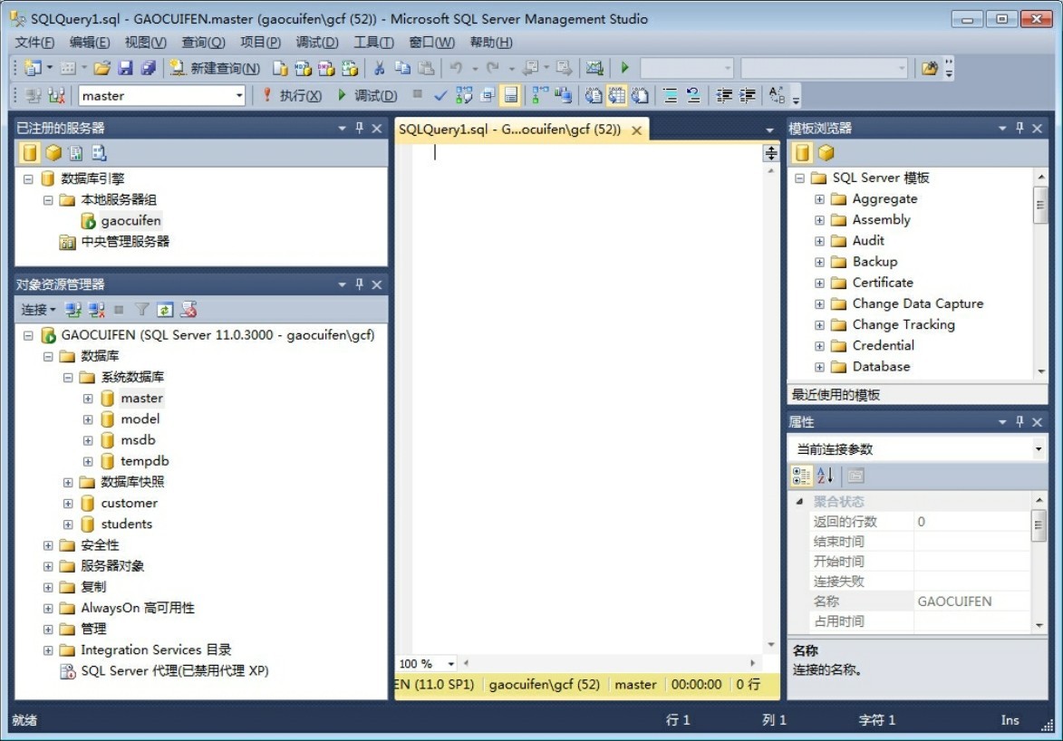 SSMS由多个管理和开发工具组成,主要包括“已注册的服务器”窗口、“对象资源管理器”窗口,“查询编辑器”窗口、“模板浏览器”窗口、“解决方案资源管理器”窗口等。
