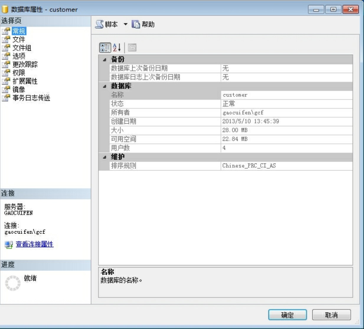 对于已经建立好的数据库,我们可以利用企业管理器来查看数据库信息。其方法是用右键单击选中的数据库,然后选择“属性”即可,如图8-1所示。