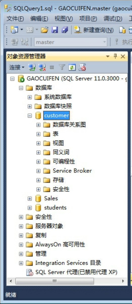 已经建立的数据库包含很多对象,如表、视图、存储过程、角色、规则等。连接数据库引擎后,在对象资源管理器中即可展开数据库查看更多数据库对象,如图8-2所示。通常可以在查询分析器中利用USE语句打开或切换至不同的数据库。