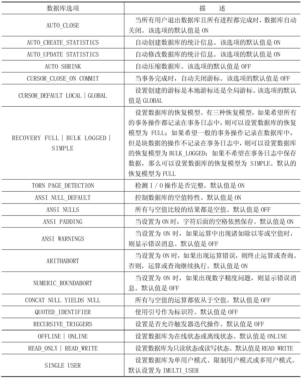 在如图8-3所示的数据库的“选项”页面中,只能设置数据库的常用选项,有些选项没有出现在该页面中。如果希望设置所有的选项,那么可以使用ALTER DATABASE语句的SET子句。SQL Server系统提供的选项如表8-1所示。