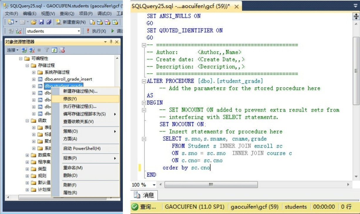 当需要修改存储过程的时候,可以通过SQL Server Management Studio实现,也可以通过执行ALTER PROCEDURE语句来实现。