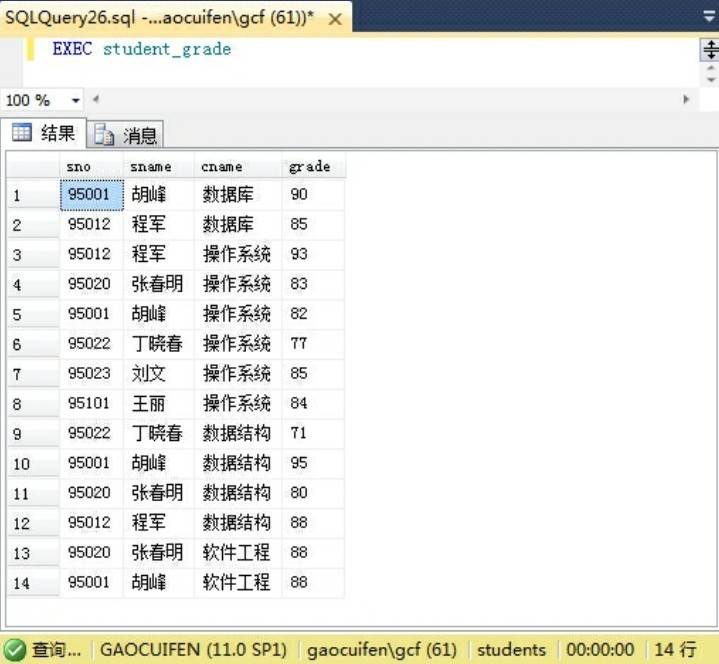 再次执行该存储过程,结果集按照课程进行排序,结果如图9-30所示。