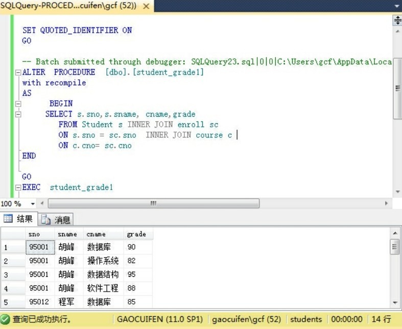②若要将修改信息保存到过程定义中,请在“查询”菜单上选择“执行”。