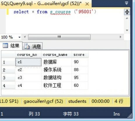 例9-28的调用为select * from s_course ('95001'),具体的执行结果如图9-39所示。