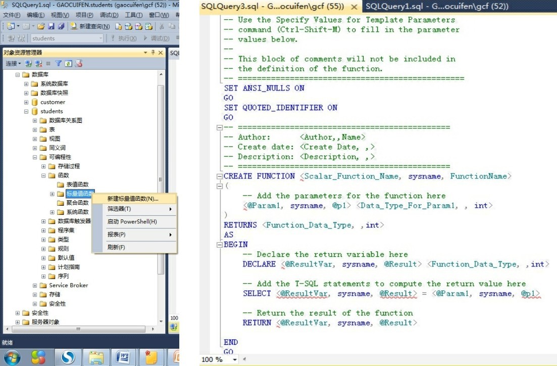 (2) 展开“数据库”,选择要创建函数的数据库,展开“可编程性”,右键选择“函数”,右键选择要创建的函数类型,再新建函数,显示模板,如图9-34所示。