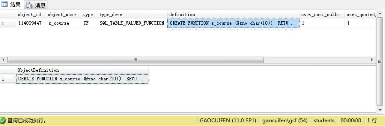 (3) 输入以下代码到查询窗口中(查询s_course的定义),然后选择“执行”。