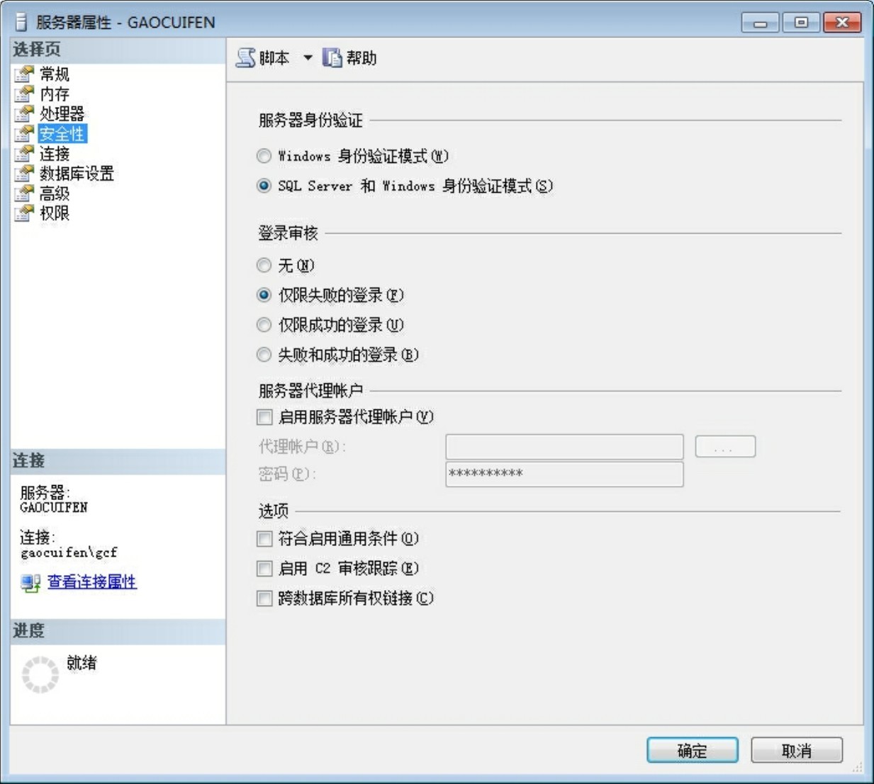 设置安全验证模式需要使用Windows身份登录,通过企业管理器来设置安全验证模式。选择要设置的服务器组,然后右键单击要设置安全验证模式的服务器,并在弹出的快捷菜单中选择“属性”菜单项,选择“安全性”选项卡,在图10-1所示的界面中选择“Windows身份验证模式”或“SQL Server和Windows身份验证模式”。设置改变后,必须停止并重新启动SQL Server服务器,设置才会生效。