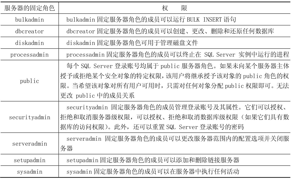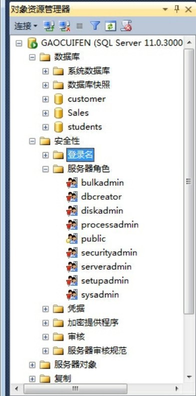 服务器角色是一些系统已定义好操作权限的用户组,其中的成员是登录账号。服务器角色不能增加或删除,只能对其中的成员进行修改。