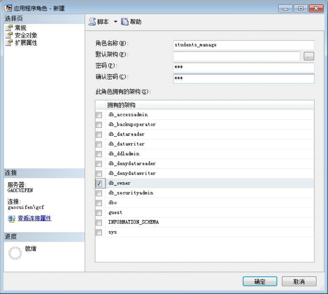 通过企业管理器创建应用程序角色,只要在“角色”节点下选择“新建应用程序角色”,在图10-10中所示的角色名称、密码、此角色拥有的架构的文本框中分别输入相应的内容,就可设置应用程序角色。如果使用T-SQL语句创建应用程序角色,则可以调用系统存储过程sp_addapprole。