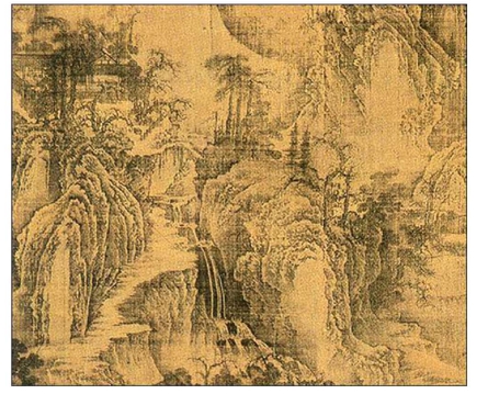 荆浩虽然也没有太多的真迹传世,但仍然在山水画史上占有非常重要的一席之地,也因为他同时还是个喜欢留言著述的人,留下来一本《笔法记》里面提到了很多关于山水画的问题,直到现在还在为人讨论。他曾经说过“吴道子画山水有笔而无墨,项容有墨而无笔。吾当采二子之所长,成一家之体”。虽然《匡庐图》在整体上仍然带有唐代山水画的装饰意味,但在表现的真实感、体积感,以及画面用笔、用墨等诸多方面与唐代画家相比,已经有了很大发展。他的这种画法对北宋的大山水画家李成、范宽等人都有相当影响,在北宋山水画坛成为占据绝对优势的风格。