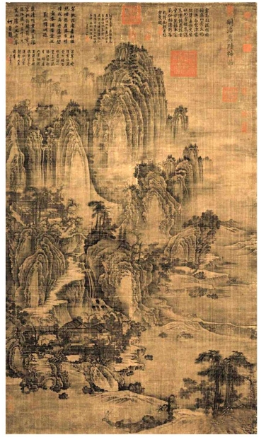 这张《匡庐图》,是否比前面的《游春图》或者《明皇幸蜀图》更为贴近你概念中的中国传统山水画呢?的确,山水画由唐发展至后代,特别是当文人画兴起之后,水墨山水成为山水画中最主要的种类,青绿山水虽然并没有完全销声匿迹,但在数量与受推崇的程度上与水墨山水已不可同日而语,而这其间,绘画本身的问题有时甚至退至其次,一些更为宽泛的文化问题反而成为讨论的焦点。
