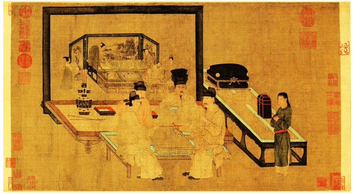 就拿这画中下棋的4人来说吧,李璟谦让东宫之位的原因可能与他猜度父亲李昪的心意,以及朝中形势有关。李昪在5个儿子中并不是最偏爱李璟,他总觉得这个大儿子过于文弱,无法担当国家重任,只是又怕破坏了长子继承的规矩会引起更大的朝野骚乱;当时朝中的权臣宋齐丘也明白李昪的真意,他开始支持的是李昪二子李景迁,也就是画面中唯一没有出现的那位,李景迁据说是位风度和雅、神观爽迈的少年,做起事来干脆果断,与其他几个儿子都不太一样,深得李昪喜爱,只是这位李景迁在937年,未满20岁时就病死在扬州。宋齐丘转而支持三子李景遂,也就是画中着朱衣者,历史中记载他是个颇有手腕的角色,平时轻财好客,十分善于拉拢人心。宋齐丘对于李景遂的支持时间非常长,即使在李璟已经登上皇位之后,仍然诏告天下,册立李景遂为“太弟”,一直住在只有太子才能居住的“东宫”,这无疑是在告诉天下,如果哪天李璟去世了,继承王位的不是李璟的儿子,而是太弟李景遂。这种情形一直到李璟后来除掉宋齐丘势力后,才得以完全改变。李景遂将东宫腾给了新立的太子,但不久之后仍然被心有不安的太子毒死。画中坐在李璟左方,举棋留须者是5个儿子中的老四李景达;对面最年轻的那位是李昪非常宠爱的幼子李景逿,他们在帝位之争中没有特殊的能力与地位。不过即使如李璟与李景遂之间可能产生的冲突,他们兄弟5人之间的关系并没有像历史中许多王位之争中达到的那般骨肉残杀,而似乎是一直维持着一种亲近的关系,这无疑与李璟温和的性格有着很大的关系。当李璟力辞被立为太子时,他给出的一个重要理由就是认为兄弟间和睦友善,无须过早立嗣,这其中虽然有可能存在一些政治上的其他因素,但仍然足以反映他们相互之间的关系整体上讲是融洽的。看这幅《重屏会棋图》,完全是贵族闲居燕乐的样子,虽然面貌中都透着一种威严的神情,不过画面整体氛围依然是清新闲逸,让人神往的。画家用看似简单的室内摆设,以及主要人物的神情动态刻画,将一种史书记载的南唐文化的清新与文人气氛到位地传达出来,不是一般的画者能够做到的。