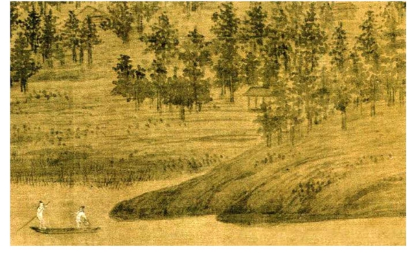 荆浩、关仝生活在河南、陕西北方地区,面对的是太行巍巍石山,而《潇湘图》的作者董源是一位生活在当时金陵、今天南京的南方人。这幅画仍然没有画家的题款或者命名,“潇湘图”是由明代一位非常有名的画家、艺术理论家董其昌取自南朝谢眺《新亭渚别范零陵云》一首诗的首旬“洞庭张乐地,潇湘帝子游”的诗意。“新亭”是今天的江苏镇江,而“范零陵”是古代一种以官职称人的方式,指的是任零陵(今湖南零陵县北)内史的范云,这是一首送别的诗,董其昌是否也将此画视为一张送别的画作呢?