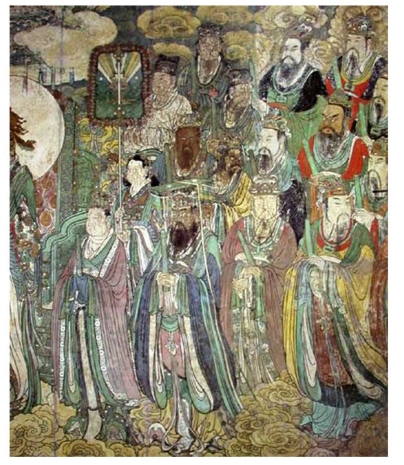 山西芮城的永乐镇,据说是道教全真派“师祖”吕洞宾的故乡,唐朝时候这里就建有吕公祠。后来,吕公祠在一次大火中被烧毁,这件事发生在1244年,当时正值全真教兴盛的时期,因此没过多久,一座新的更宏伟壮观的道教宫殿就开始在这里拔地而起了,这就是元代全真教的中心,著名的永乐宫。永乐宫的修建前后共花了110年,它是一个有着典型的元代建筑特色的宫殿群,建筑的外观简洁明朗,然而当你走入大殿,而眼睛也逐渐适应了殿内微弱的光线的时候,那些布满墙壁,高达数米的彩色壁画顿时占领了视线的每一个角落,直把你带进一个仙乐飘飘、衣袂舞动的太清世界。