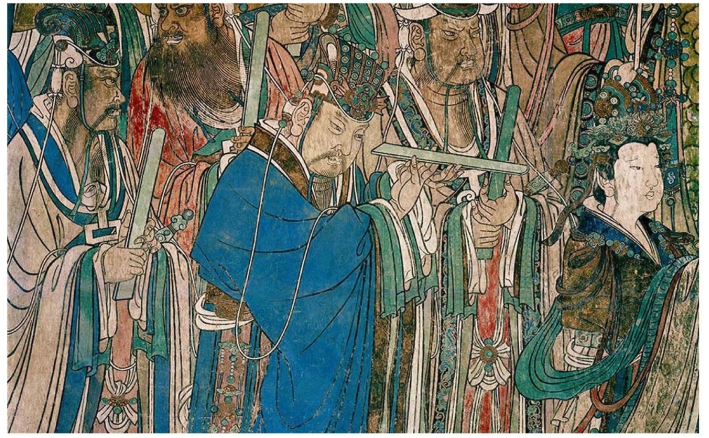 三清殿是永乐宫的主殿,殿内的西、北、东三面绘满了各种神仙人物,讲述的是道教众神仙朝元的盛况。其中描绘了8位身高3米的主神,另有280余名神仙组成长长的行列,分列四排围绕在主神的周围。在神仙的行列中,有庄严肃穆的帝君,仙风飘逸的仙伯、真人,有孔武彪悍、鬓发飞扬的力士,更有清秀美丽、含情微笑的玉女,她们有的在窃窃私语,有的在凝目沉思。尽管人物众多,但每一个人物都各有特色,他们通过神情动态相互呼应,在迎风飘举的衣带、舞动的旌幡和缭绕的祥云的联结下,构成了一个浩浩荡荡、款款前行的方阵。