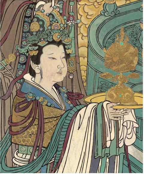 三清殿神仙朝元的画面与宋代画家《朝元仙杖图》非常接近,显然是一脉相承的。它们沿袭的都是唐代吴道子创造的豪迈雄健、典雅庄重的壁画风格,人物个个气质轩昂,勾线气势磅礴,细节刻画入微,有很强的真实感。比如人物的发须,必须要表现得如从真肉中长出,面部和衣裳上的渲染也比较强调真实的透视效果。三清殿的《朝元图》在用色上,采用的也是传统的重彩勾填方法,以墨线为骨干,再填以朱、黄、蓝、紫、白、赭等色彩,为了突出衣冠、饰物精美华丽的视觉效果,还在这些部位使用了“沥粉贴金”法。《朝元图》整个画面的色彩表现得相当成功,绚丽华美的色彩在成千上万根墨线的分割与调度下显得庄重而和谐!