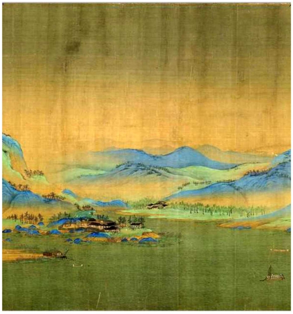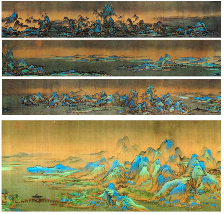 《千里江山图》画在一匹高51.5厘米,长1191.5厘米的绢上,这么大尺幅的手卷,看起来富丽堂皇,气象万千。一般的山水手卷读起来是有一种内在的节奏在其中的,就像我们欣赏西方音乐中的小奏鸣曲,不同的乐章间存在着曲式的变化,而画作也是分着不同的画面部分的。开首有时总是小径通幽,像一种平稳的陈述,只是将你引进这个世界;接下来便是峰回路转,或是崇山峻岭,犹如小奏鸣曲的第二部分,绵密集中,丰富活跃,集众多精彩于一处,是画面的高潮;再往后又~次回复行板速度,平缓下来,一片江渚,一带远山,或有人放渔江中,或有人举手眺望,将人的想象与思绪领入更为自由、缥缈的画外空间。而这卷长达近12米的长卷则远比一首短小精致的小奏鸣曲要繁复、精彩太多。如果用西方最经典的焦点透视法作画,是无法画出这么长的一幅画作的,而中国传统作画方式的特点之一即是“多点透视”,画家不用固定自己的位置,只画一个角度所看到的东西,他可以边走边看,笔下的画也可以随着他的行动而变换着画作的视角,让读者读起来有一种流动感,似乎也在随着画家一起游山玩水。
