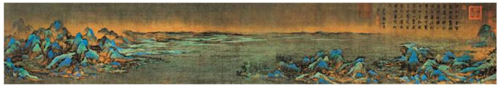 这幅青绿山水出现在山水画已经发展到某个高度的历史时期,将青绿山水的装饰、趣味,掺入更晚近山水的皴法、用笔意趣,无愧卷后有人称赞:“在古今丹青小景中, 自可独步千载,殆众星之孤月耳。”千余年又过去了,这句话挪用于今,仍然是不为过的。