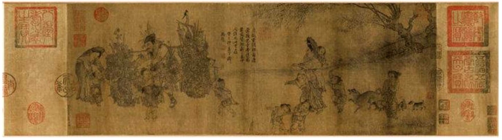 每个看这幅画的人都会被其中浓厚的生活情趣所打动,被它逗乐,虽然每个小孩面容的刻画没有苏汉臣那么细腻入微,却更像我们随处可见的顽童,更能引起观画者的共鸣。李嵩原来并不是画家,学的是木匠活儿,后来被绍兴画院画家李从训收为养子,才开始跟他学画,代职于宋光宗、宁宗、理宗三朝画院,作为画家自然也是面面俱到,什么都能画,不过风俗画是他最擅长的一类,现实生活气息十分浓厚,少了些贵族或者文人气,这可能与他从小的经历有关系吧。虽然对于人物刻画李嵩没有苏汉臣那么精细,但并不能因此而否定他画作中细节把握的功夫,只看货郎的担子与身上,品种繁多,杂而不乱,李嵩还有一张《花篮图》存世,画栀子、石榴、萱花等各种夏季花卉,也令人称绝。
