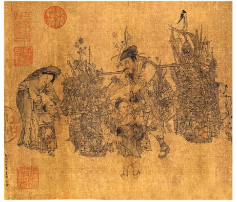 《货郎图》的背景,草坡新柳,无人工雕琢庭院之气,一看便知是某个村头小景,这些地方的集市不如城中方便集中,便时常会有挑着小担的货郎来吆喝卖货,《梦粱录》中记载,南宋时期,这种挑担推车、走村串巷的货郎行当十分活跃,他们“装饰车盖担儿”,“以炫耀人耳目”,看这位师傅担上放的,身上背的,背后插的,就知道此非诳语。闲着的妇人小孩自然是最喜欢听到他们吆喝的人群,呼之即来,正如画面中呈现出来的一样。