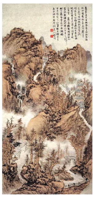 禅理的深奥玄妙,禅僧的机锋警语,禅宗所特有的瞬间顿悟的思维方式,凝炼含蓄的表达方式以及适度淡泊的审美情趣,一直都是“文人画”所极力追求的,所以士人论画都认为“画贵有禅气”,“禅气”者正是以“禅”去观察自然、理解自然、概括自然进而渗透在画面上的一种特殊气息。清初画坛,“四僧”(髡残、弘仁、朱耷、石涛)的画风之所以能相对“四王”(王时敏、王鉴、王翚、王原祁)而形成一股新的潮流,关键就在于“四僧”的画作富于这种“禅气”。清秦祖永在《桐荫论画》中说:“石道人残笔墨苍莽高古,盖胸中一股孤高奇逸之气毕露笔端。”的确,“四王”作画着意于笔墨,而“四僧”论气韵。画中有作者的自题诗:“苍翠凌天半,松风晨夕吹。飞泉悬树杪,清磬彻山陲。屋古摩崖立,花明倚披。”钤有“石奚谷”、“电住道人”白文印二方。署年“庚子”,即清顺治十七年(公元1660年)。