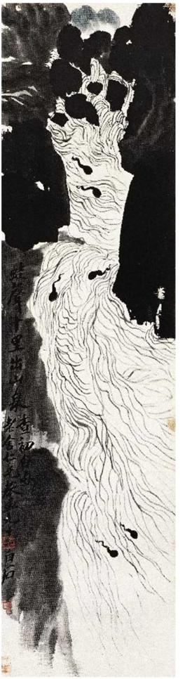 其次,齐白石画得好,构图奇特,用笔老辣生动,富于美感。这幅画是一幅立轴作品。如果齐白石以横幅的形式来画,那么泉水便是横流,不论自东而西,还是自西而东,给人带来的总是一种停滞的感觉,泉水显得无力,泉声无法激荡出来,泉中的蝌蚪也会没有活力,那蛙声就很难显现出来了。但是采用了立轴的形式,结果就不一样了。在立轴作品里,泉水是很自然地自上而下流淌的,它能给人带来一种激荡的逼迫感。 自上而下地画了山石、泉水和蝌蚪,山石、蝌蚪用浓墨画出,周围施以淡墨渲染;泉水以淡墨勾勒,潇洒灵动,生涩老辣。当然画中的蝌蚪也是不可缺少的部分,应该是画的点睛之笔。画中有六只蝌蚪,每两个一组分布于画的上、中、下三个部分。这样分布就使得画面显得完满、不空洞。而数量又使得画面不显杂乱,可谓“添一分太肥,减一分太瘦”,恰到好处便是最好。蝌蚪似乎并不是很乐意地顺流而下,它们一个个侧着身子试图逆向游回泉水的上游,不禁令人想到它们是不是听到了青蛙的鸣叫声,听到了母亲的召唤,而要游回故乡呢?