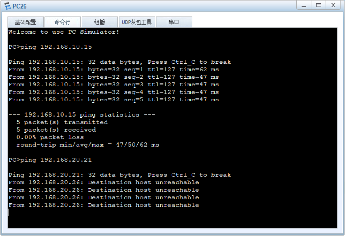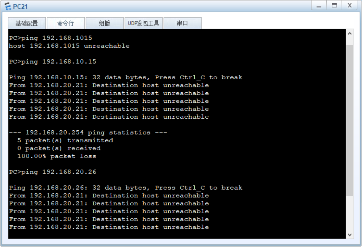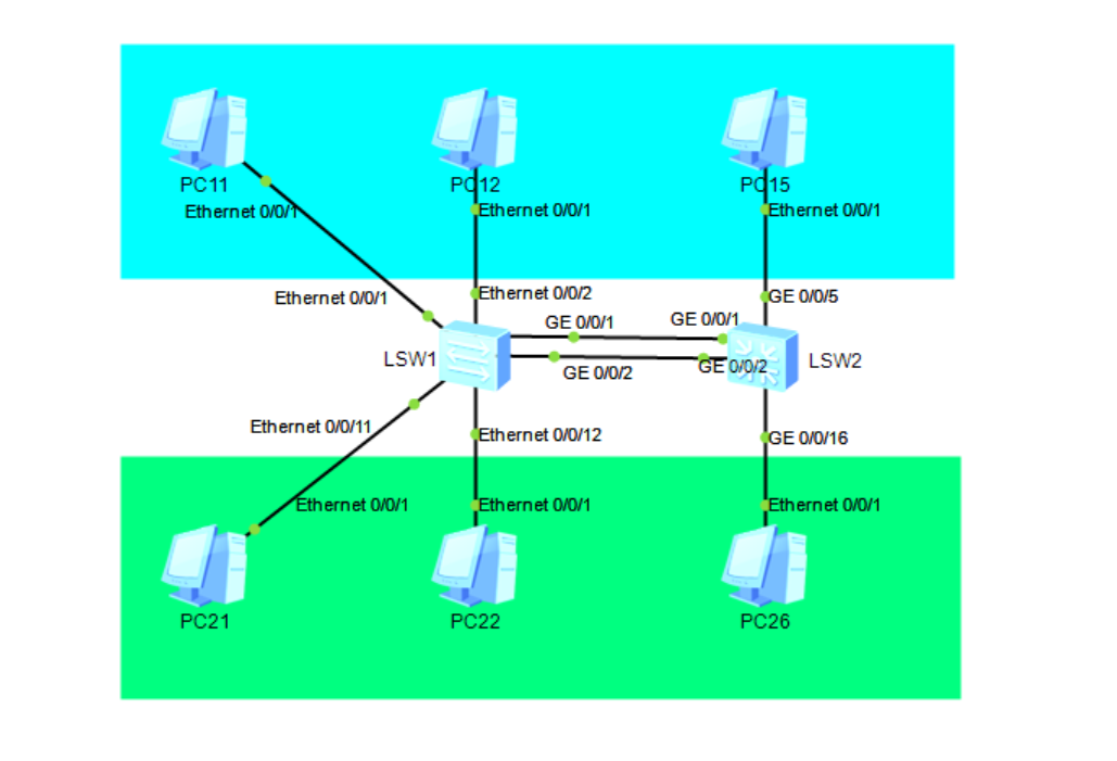 要求VLAN10中的PC11、PC12、PC15和VLAN20中的PC21、PC22、PC26互通。