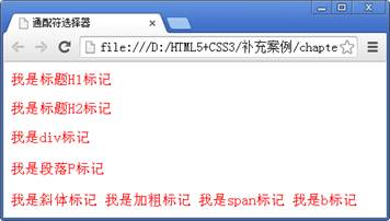 使用CSS对网页进行修饰时,如果需要设置的样式对所有的HTML标记都生效,就需要使用通配符选择器。本案例通过使用通配符选择器来控制页面中的所有元素,达到页面中的所有元素都显示同一种样式的效果。