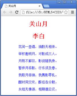 通过前两个案例,我们知道了两种引入CSS样式表的方法,下面将介绍另一种引入CSS样式表的方法:导入式。同时,还将介绍一种新的基础选择器—标记选择器。本案例通过使用标记选择器来控制元素,并运用CSS导入式的方法来输出一首诗《关山月》。