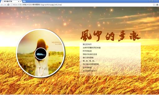 至此,我们就完成了效果图8-15所示音乐播放界面的CSS样式部分。将该样式应用于网页后,效果如图8-18所示。