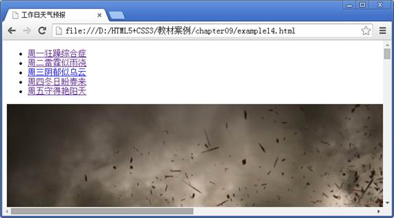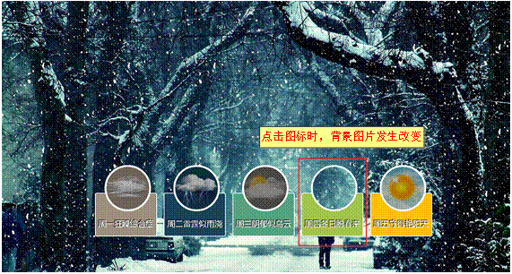 当鼠标点击网页中的天气图标时,网页中的背景图片将发生改变,且切换背景图片时会产生不同的动画效果。如图9-26所示即为点击“周四冬日盼春来”图标时的网页效果。