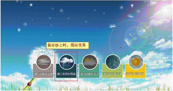 当鼠标移上网页中的圆形天气图标时,图标中的图片将会变亮,效果如图9-25所示。