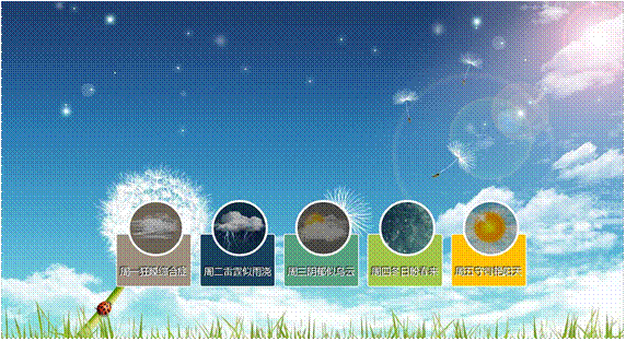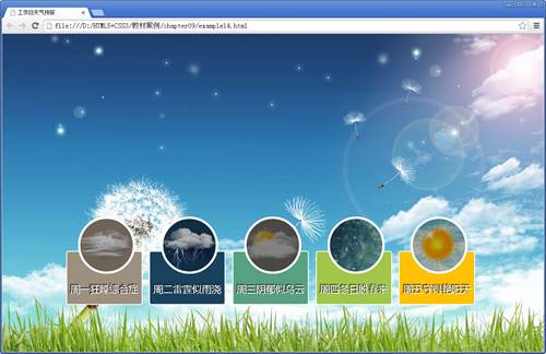 本章前几节重点讲解了CSS3中的高级应用,包括过渡、变形及动画等。为了使读者更好地理解这些应用,并能够熟练运用相关属性实现元素的过渡、平移、缩放、倾斜、旋转及动画等特效,本节将通过案例的形式分步骤地制作工作日天气预报的主题页面,其默认效果如图9-24所示。