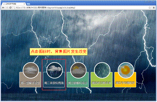 保存CSS样式文件,刷新页面,点击天气图标时,背景图片发生改变,效果如图9-30所示。