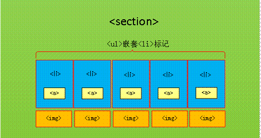 观察效果图9-24不难看出,整个页面可以分为背景图片和天气图标两部分,这两部分内容均嵌套在<section>标记内部,其中背景图片模块由<img>标记定义。天气图标模块整体上由无序列表<ul>布局,并由<li>标记嵌套<a>标记构成,每个<a>标记代表天气图标中的圆角矩形模块。效果图9-24对应的结构如图9-27所示。