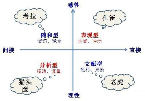 通过借鉴美国心理学家威廉·莫尔顿·马斯顿博士的DISC行为风格理论,人群中的人际风格倾向大致可以按“感性-理性”“直接-间接”作为坐标分为四种: