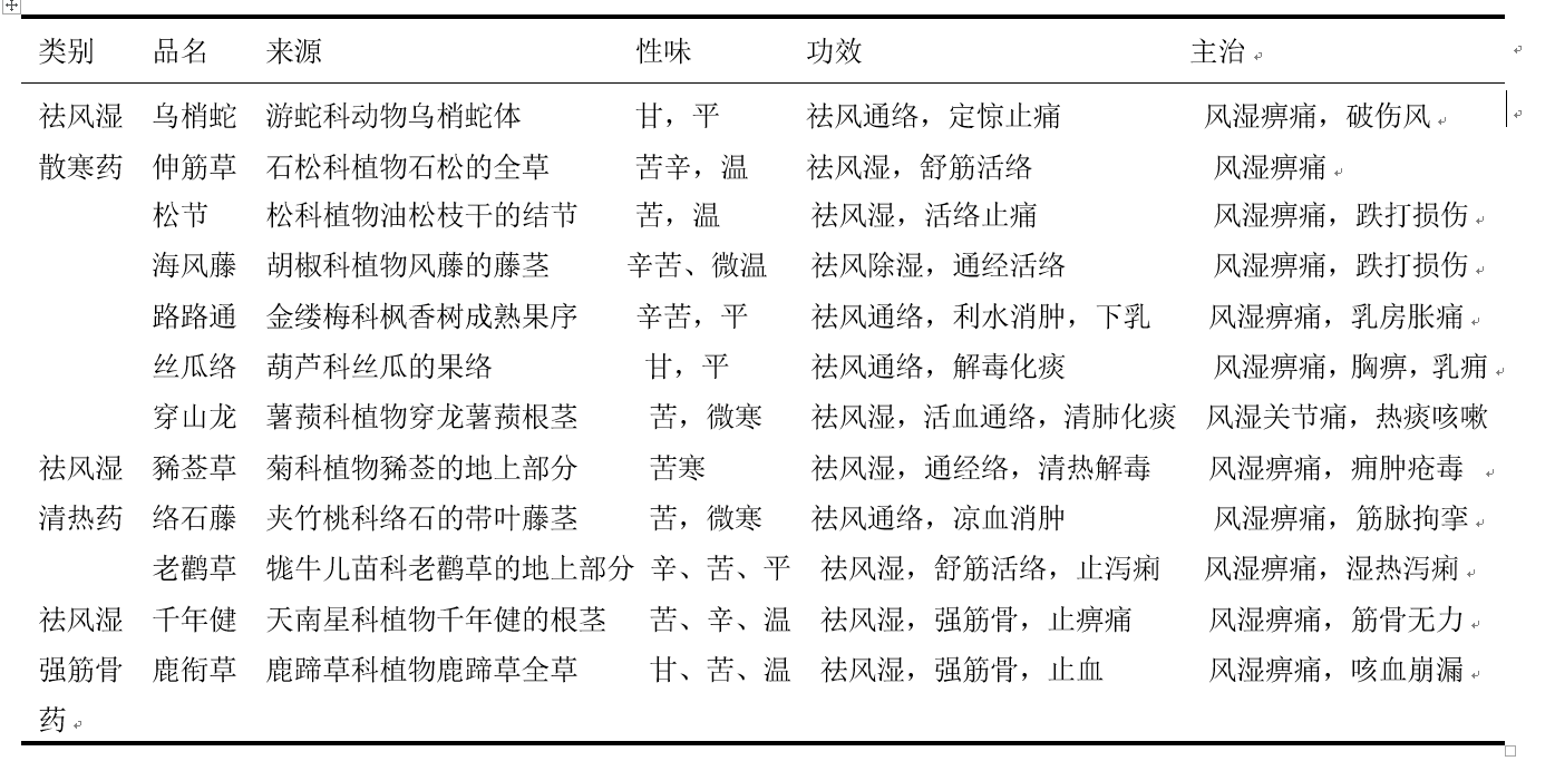 本类药物多辛香苦燥走散,既善祛除留着肌表、经络的风湿,又兼止痹痛、通经络、强筋骨。主治风湿痹痛、筋脉拘挛、麻木不仁、腰膝酸痛、半身不遂、下肢痿弱等证。