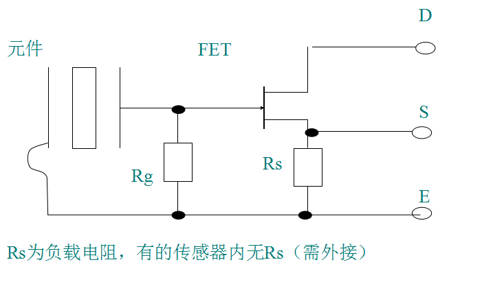 电路结构是一个在负载电阻上并联一个电容的电流发生器,其输出阻抗极高,输出电压信号又极其微弱。管内有场效应管FET放大器及厚膜电阻,以达到阻抗变换的目的。