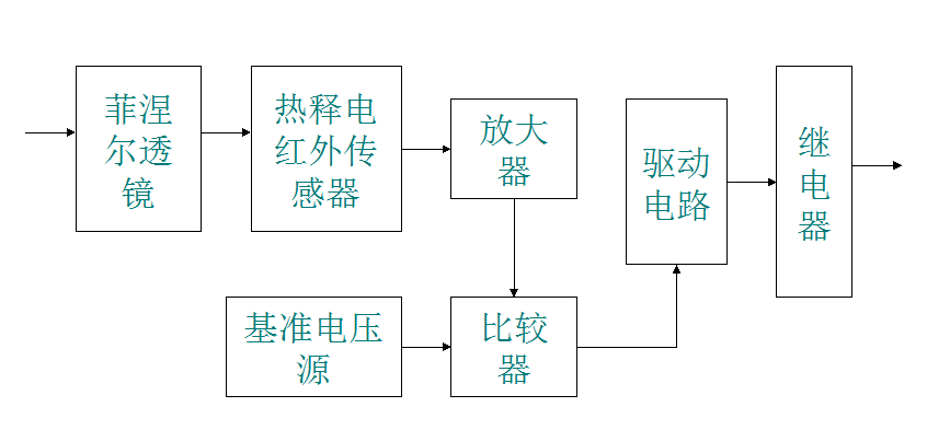 热释电红外探测模块由菲涅尔透镜、热释电红外传感器、放大器、基准电压源、比较器、驱动放大电路、继电器或晶闸管组成,如下图所示: