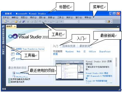 Visual Studio 2010起始页主要由标题栏、菜单栏、工具栏、最近使用的项目、最新新闻、入门、工具箱等组成。其中,标题栏、菜单栏、工具栏与Windows标准窗口类似,这里不再介绍,其他部分的含义介绍如下。