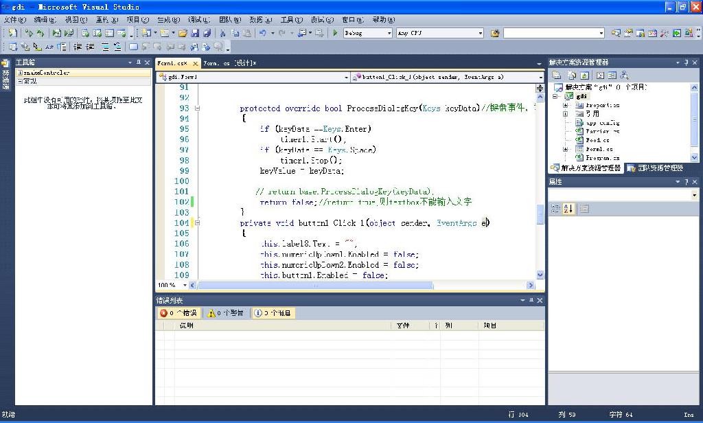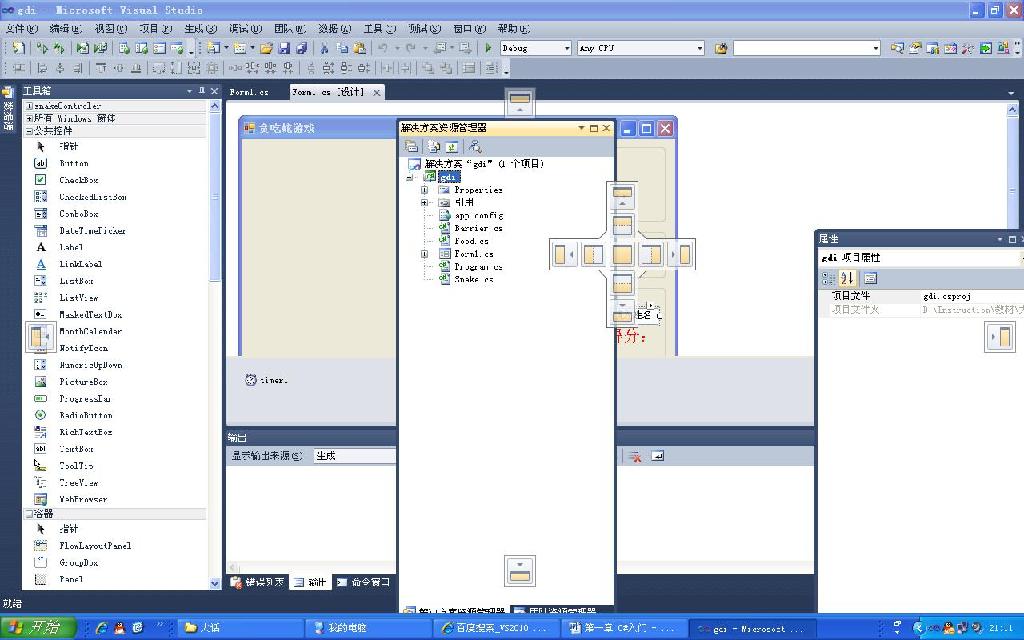 Visual Studio 2010典型主界面包含用户编辑区、【工具箱】窗口、【解决方案资源管理器】窗口、【属性】窗口以及【输出】窗口等。它们的功能分别介绍如下。